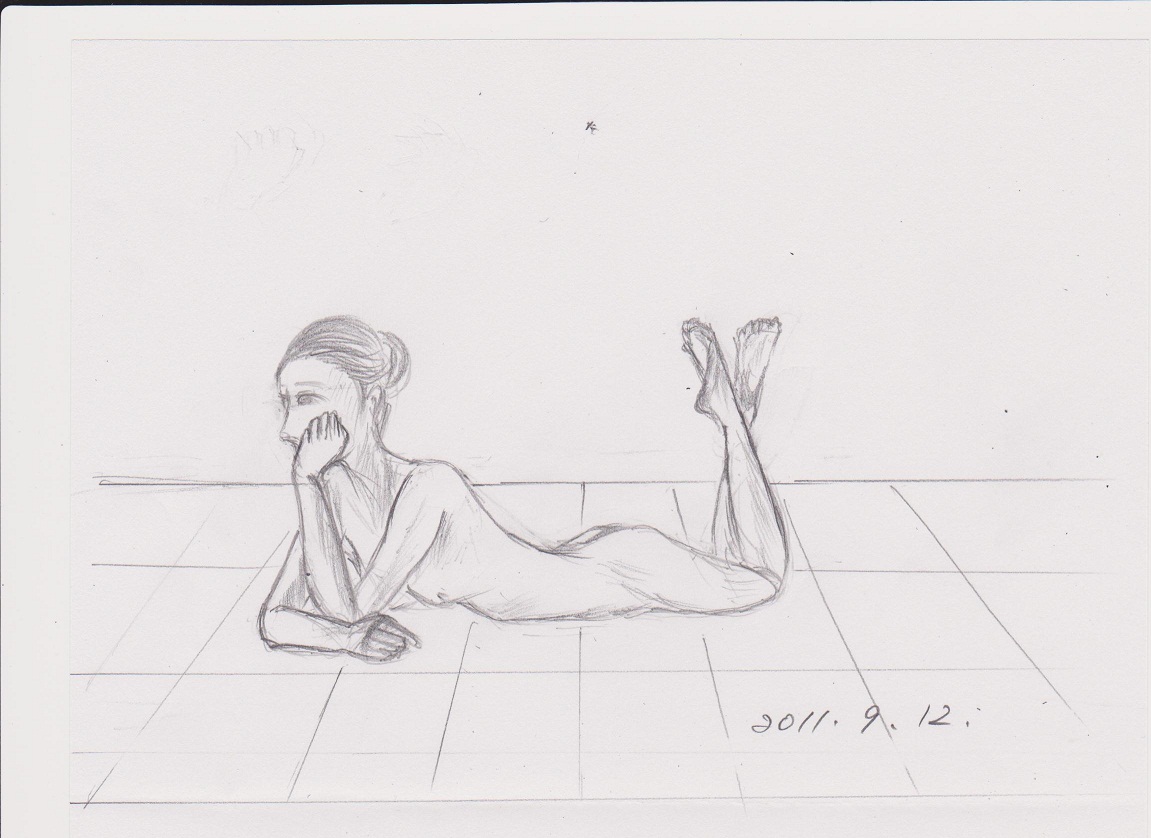 タイルの線と体の接地部分があってるかどうか。絵に描いたような消失点だったら尻がもう少し見えるし右ひざの裏ももっと見える。